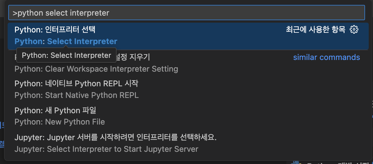 VS Code에서 Ctrl + Shift + P (macOS: Cmd + Shift + P)를 눌러 "Python: Select Interpreter" 검색