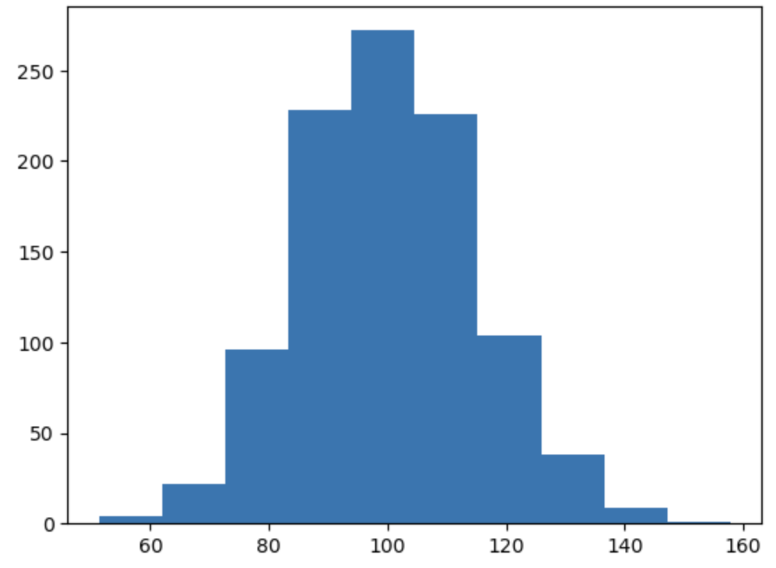 # 평균이 100이고 표준편차가 15인 정규분포를 따르는 1000개의 데이터 생성