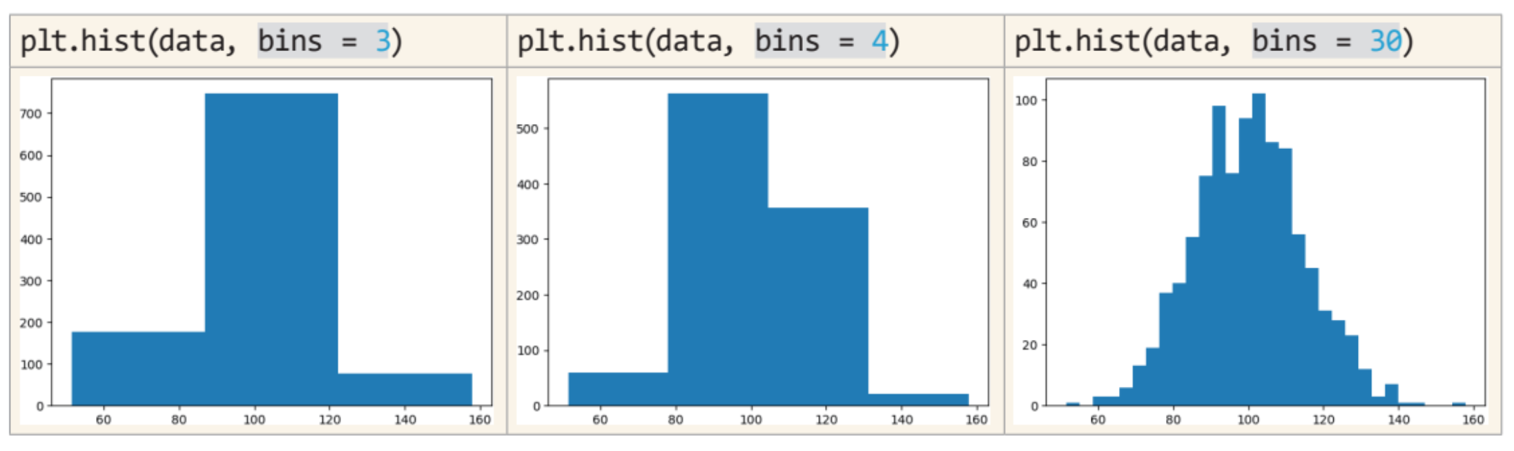 - 히스토그램을 만들 데이터의 값을 동일한 구간으로 나누어 담는 통을 빈이라고 한다. (디폴트값은 bins = 10)