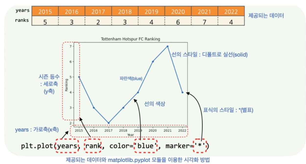 - plt.axis([x축 시작, x축 끝, y축 시작, y축 끝]): 축의 범위를 지정(그림 그릴 영역 지정)