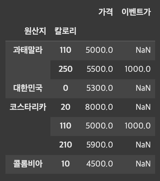 df.groupby(['원산지','칼로리']).mean(numeric_only=True)