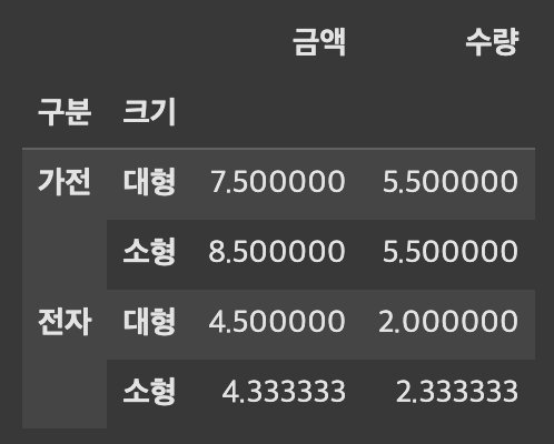 df.pivot_table(index=["구분", "크기"], values=["수량", "금액"], aggfunc={"수량": "mean", "금액": "mean"})