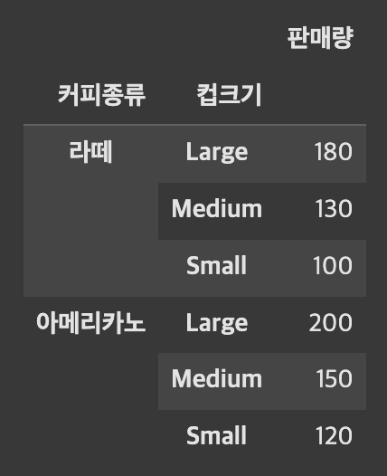 level = -1은 가장 오른쪽에 그룹핑되어있는 컬럼을 말한다. 즉, '컵크기' 안의 Small Medium Large가 컬럼이 된다.