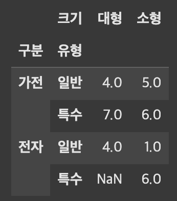df.pivot_table(index=["구분", "유형"], columns="크기", values="수량", aggfunc="sum")