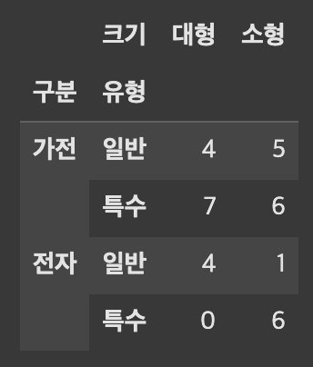 df.pivot_table(index=["구분", "유형"], columns="크기", values="수량", aggfunc="sum", fill_value=0)