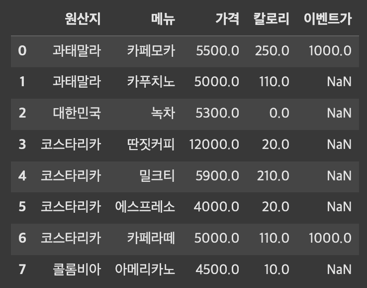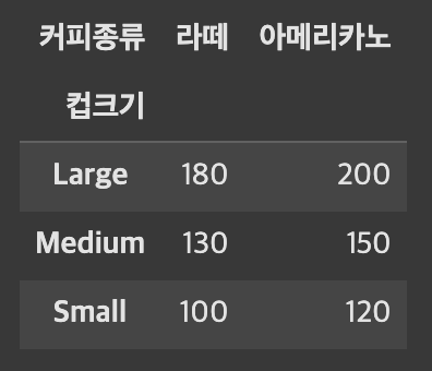 '커피종류': ['아메리카노', '아메리카노', '아메리카노', '라떼', '라떼', '라떼'],