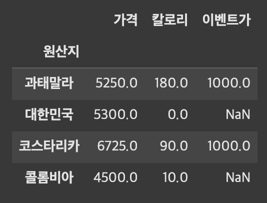 집계시 NaN으로 되어있는 경우 fill_value를 통해 fillna와 같이 결측치에 지정 값을 넣을 수 있다.