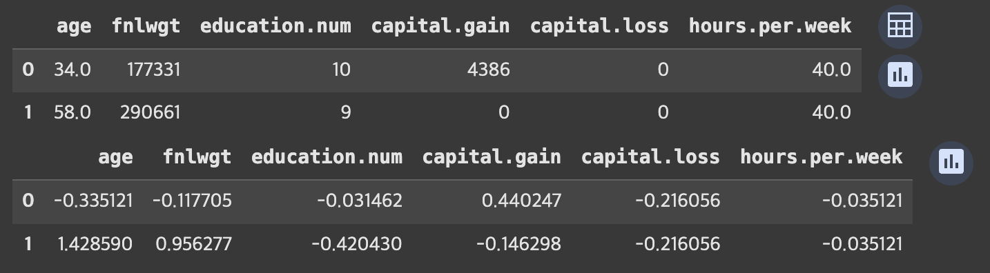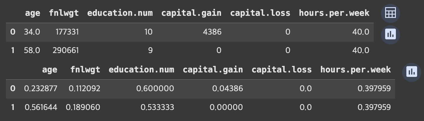 cols = ['age', 'fnlwgt', 'education.num', 'capital.gain', 'capital.loss', 'hours.per.week']